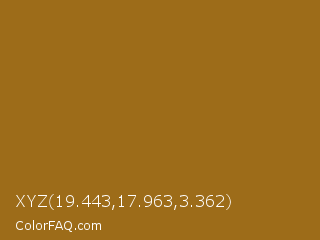 XYZ 19.443,17.963,3.362 Color is a normal orange color and the nearest color is Sand Dune #967117. Hex code #9d6c19 and RGB value is rgb(157,108,25). In RGB color space, this color is composed of 62% red, 42% green, 10% blue, In CMYK color space, this color is composed of 0% cyan, 31% magenta, 84% yellow , 38% black , In HSL color space, this color has a hue angle of 38° , 73% saturation and 36% lightness.
