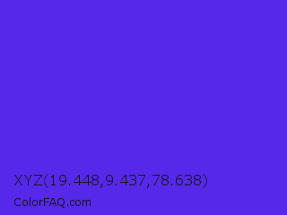 XYZ 19.448,9.437,78.638 Color is a normal indigo color and the nearest color is Han Purple #5218fa. Hex code #5628ea and RGB value is rgb(86,40,234). In RGB color space, this color is composed of 34% red, 16% green, 92% blue, In CMYK color space, this color is composed of 63% cyan, 83% magenta, 0% yellow , 8% black , In HSL color space, this color has a hue angle of 254° , 82% saturation and 54% lightness.