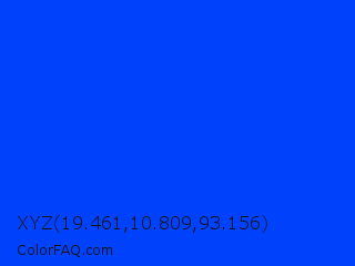 XYZ 19.461,10.809,93.156 Color is a normal blue color and the nearest color is Blue RYB #0247fe. Hex code #0041fc and RGB value is rgb(0,65,252). In RGB color space, this color is composed of 0% red, 25% green, 99% blue, In CMYK color space, this color is composed of 100% cyan, 74% magenta, 0% yellow , 1% black , In HSL color space, this color has a hue angle of 225° , 100% saturation and 49% lightness.