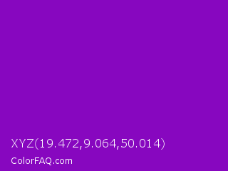 XYZ 19.472,9.064,50.014 Color is a normal purple color and the nearest color is French Violet #8806ce. Hex code #8707bf and RGB value is rgb(135,7,191). In RGB color space, this color is composed of 53% red, 3% green, 75% blue, In CMYK color space, this color is composed of 29% cyan, 96% magenta, 0% yellow , 25% black , In HSL color space, this color has a hue angle of 282° , 93% saturation and 39% lightness.