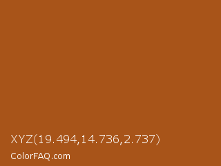 XYZ 19.494,14.736,2.737 Color is a normal orange color and the nearest color is Hawaiian Tan #9d5616. Hex code #a85419 and RGB value is rgb(168,84,25). In RGB color space, this color is composed of 66% red, 33% green, 10% blue, In CMYK color space, this color is composed of 0% cyan, 50% magenta, 85% yellow , 34% black , In HSL color space, this color has a hue angle of 25° , 74% saturation and 38% lightness.