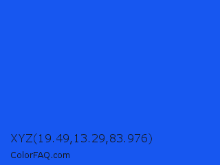 XYZ 19.49,13.29,83.976 Color is a normal blue color and the nearest color is Blue RYB #0247fe. Hex code #1757f0 and RGB value is rgb(23,87,240). In RGB color space, this color is composed of 9% red, 34% green, 94% blue, In CMYK color space, this color is composed of 90% cyan, 64% magenta, 0% yellow , 6% black , In HSL color space, this color has a hue angle of 222° , 88% saturation and 52% lightness.