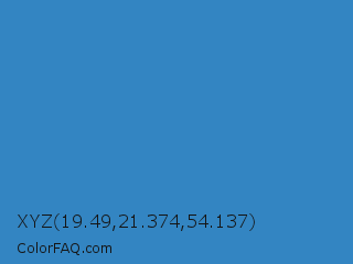 XYZ 19.49,21.374,54.137 Color is a normal blue color and the nearest color is Cyan Blue Azure #4682bf. Hex code #3385c2 and RGB value is rgb(51,133,194). In RGB color space, this color is composed of 20% red, 52% green, 76% blue, In CMYK color space, this color is composed of 74% cyan, 31% magenta, 0% yellow , 24% black , In HSL color space, this color has a hue angle of 206° , 58% saturation and 48% lightness.