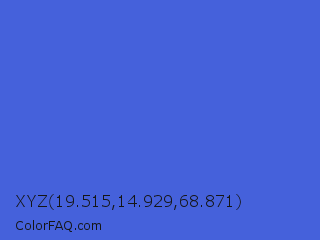 XYZ 19.515,14.929,68.871 Color is a normal blue color and the nearest color is Royal Blue #4169e1. Hex code #4561db and RGB value is rgb(69,97,219). In RGB color space, this color is composed of 27% red, 38% green, 86% blue, In CMYK color space, this color is composed of 68% cyan, 56% magenta, 0% yellow , 14% black , In HSL color space, this color has a hue angle of 229° , 68% saturation and 56% lightness.