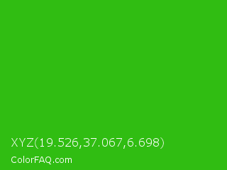 XYZ 19.526,37.067,6.698 Color is a normal green color and the nearest color is Harlequin Green #46cb18. Hex code #30bd12 and RGB value is rgb(48,189,18). In RGB color space, this color is composed of 19% red, 74% green, 7% blue, In CMYK color space, this color is composed of 75% cyan, 0% magenta, 90% yellow , 26% black , In HSL color space, this color has a hue angle of 109° , 83% saturation and 41% lightness.