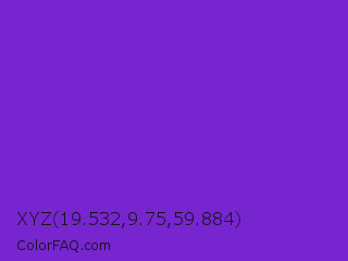 XYZ 19.532,9.75,59.884 Color is a normal violet color and the nearest color is Purple Heart Crayola #652dc1. Hex code #7725cf and RGB value is rgb(119,37,207). In RGB color space, this color is composed of 47% red, 15% green, 81% blue, In CMYK color space, this color is composed of 43% cyan, 82% magenta, 0% yellow , 19% black , In HSL color space, this color has a hue angle of 269° , 70% saturation and 48% lightness.
