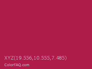 XYZ 19.556,10.555,7.485 Color is a normal rose color and the nearest color is French Wine #ac1e44. Hex code #b01c4a and RGB value is rgb(176,28,74). In RGB color space, this color is composed of 69% red, 11% green, 29% blue, In CMYK color space, this color is composed of 0% cyan, 84% magenta, 58% yellow , 31% black , In HSL color space, this color has a hue angle of 341° , 73% saturation and 40% lightness.