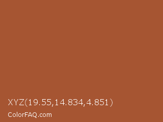 XYZ 19.55,14.834,4.851 Color is a normal orange color and the nearest color is Paarl #a65529. Hex code #a65532 and RGB value is rgb(166,85,50). In RGB color space, this color is composed of 65% red, 33% green, 20% blue, In CMYK color space, this color is composed of 0% cyan, 49% magenta, 70% yellow , 35% black , In HSL color space, this color has a hue angle of 18° , 54% saturation and 42% lightness.