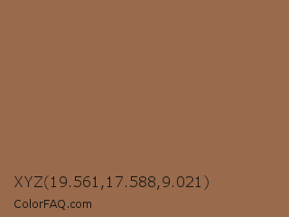 XYZ 19.561,17.588,9.021 Color is a normal orange color and the nearest color is Cape Palliser #a26645. Hex code #996a4b and RGB value is rgb(153,106,75). In RGB color space, this color is composed of 60% red, 42% green, 29% blue, In CMYK color space, this color is composed of 0% cyan, 31% magenta, 51% yellow , 40% black , In HSL color space, this color has a hue angle of 24° , 34% saturation and 45% lightness.