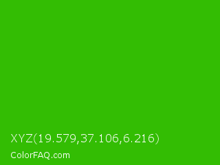 XYZ 19.579,37.106,6.216 Color is a normal green color and the nearest color is Harlequin Green #46cb18. Hex code #33bd03 and RGB value is rgb(51,189,3). In RGB color space, this color is composed of 20% red, 74% green, 1% blue, In CMYK color space, this color is composed of 73% cyan, 0% magenta, 98% yellow , 26% black , In HSL color space, this color has a hue angle of 105° , 97% saturation and 38% lightness.