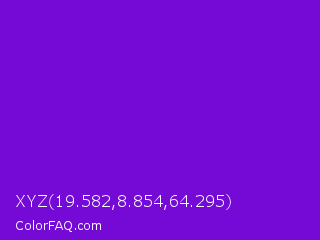XYZ 19.582,8.854,64.295 Color is a normal purple color and the nearest color is French Violet #8806ce. Hex code #750ad6 and RGB value is rgb(117,10,214). In RGB color space, this color is composed of 46% red, 4% green, 84% blue, In CMYK color space, this color is composed of 45% cyan, 95% magenta, 0% yellow , 16% black , In HSL color space, this color has a hue angle of 271° , 91% saturation and 44% lightness.