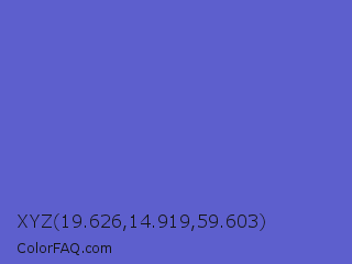 XYZ 19.626,14.919,59.603 Color is a normal blue color and the nearest color is Slate Blue #6a5acd. Hex code #5d5fcd and RGB value is rgb(93,95,205). In RGB color space, this color is composed of 36% red, 37% green, 80% blue, In CMYK color space, this color is composed of 55% cyan, 54% magenta, 0% yellow , 20% black , In HSL color space, this color has a hue angle of 239° , 53% saturation and 58% lightness.