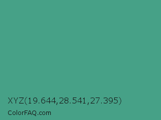 XYZ 19.644,28.541,27.395 Color is a normal green color and the nearest color is Zomp #39a78e. Hex code #46a187 and RGB value is rgb(70,161,135). In RGB color space, this color is composed of 27% red, 63% green, 53% blue, In CMYK color space, this color is composed of 57% cyan, 0% magenta, 16% yellow , 37% black , In HSL color space, this color has a hue angle of 163° , 39% saturation and 45% lightness.