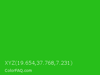 XYZ 19.654,37.768,7.231 Color is a normal green color and the nearest color is Lime Green #32cd32. Hex code #27bf1a and RGB value is rgb(39,191,26). In RGB color space, this color is composed of 15% red, 75% green, 10% blue, In CMYK color space, this color is composed of 80% cyan, 0% magenta, 86% yellow , 25% black , In HSL color space, this color has a hue angle of 115° , 76% saturation and 43% lightness.