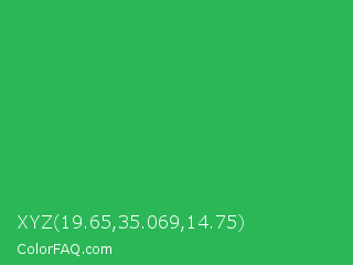 XYZ 19.65,35.069,14.75 Color is a normal green color and the nearest color is Chateau Green #40a860. Hex code #2bb757 and RGB value is rgb(43,183,87). In RGB color space, this color is composed of 17% red, 72% green, 34% blue, In CMYK color space, this color is composed of 77% cyan, 0% magenta, 52% yellow , 28% black , In HSL color space, this color has a hue angle of 139° , 62% saturation and 44% lightness.