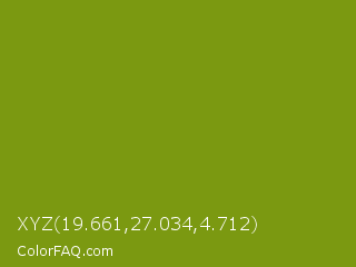 XYZ 19.661,27.034,4.712 Color is a normal lime color and the nearest color is Trendy Green #7c881a. Hex code #7b9911 and RGB value is rgb(123,153,17). In RGB color space, this color is composed of 48% red, 60% green, 7% blue, In CMYK color space, this color is composed of 20% cyan, 0% magenta, 89% yellow , 40% black , In HSL color space, this color has a hue angle of 73° , 80% saturation and 33% lightness.