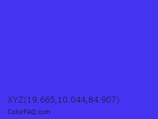 XYZ 19.665,10.044,84.907 Color is a normal indigo color and the nearest color is Han Purple #5218fa. Hex code #4533f2 and RGB value is rgb(69,51,242). In RGB color space, this color is composed of 27% red, 20% green, 95% blue, In CMYK color space, this color is composed of 71% cyan, 79% magenta, 0% yellow , 5% black , In HSL color space, this color has a hue angle of 246° , 88% saturation and 57% lightness.