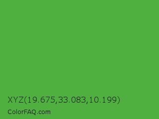 XYZ 19.675,33.083,10.199 Color is a normal green color and the nearest color is Apple #4fa83d. Hex code #4fb040 and RGB value is rgb(79,176,64). In RGB color space, this color is composed of 31% red, 69% green, 25% blue, In CMYK color space, this color is composed of 55% cyan, 0% magenta, 64% yellow , 31% black , In HSL color space, this color has a hue angle of 112° , 47% saturation and 47% lightness.