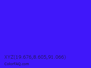 XYZ 19.676,8.605,91.066 Color is a normal indigo color and the nearest color is Han Purple #5218fa. Hex code #4017fa and RGB value is rgb(64,23,250). In RGB color space, this color is composed of 25% red, 9% green, 98% blue, In CMYK color space, this color is composed of 74% cyan, 91% magenta, 0% yellow , 2% black , In HSL color space, this color has a hue angle of 251° , 96% saturation and 54% lightness.
