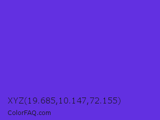 XYZ 19.685,10.147,72.155 Color is a normal indigo color and the nearest color is Purple Heart Crayola #652dc1. Hex code #6230e1 and RGB value is rgb(98,48,225). In RGB color space, this color is composed of 38% red, 19% green, 88% blue, In CMYK color space, this color is composed of 56% cyan, 79% magenta, 0% yellow , 12% black , In HSL color space, this color has a hue angle of 257° , 75% saturation and 54% lightness.