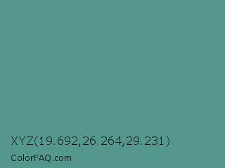 XYZ 19.692,26.264,29.231 Color is a normal cyan color and the nearest color is Patina #639a8f. Hex code #54988d and RGB value is rgb(84,152,141). In RGB color space, this color is composed of 33% red, 60% green, 55% blue, In CMYK color space, this color is composed of 45% cyan, 0% magenta, 7% yellow , 40% black , In HSL color space, this color has a hue angle of 170° , 29% saturation and 46% lightness.