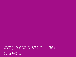 XYZ 19.692,9.852,24.156 Color is a normal magenta color and the nearest color is Violet Eggplant #991199. Hex code #a30d88 and RGB value is rgb(163,13,136). In RGB color space, this color is composed of 64% red, 5% green, 53% blue, In CMYK color space, this color is composed of 0% cyan, 92% magenta, 17% yellow , 36% black , In HSL color space, this color has a hue angle of 311° , 85% saturation and 35% lightness.