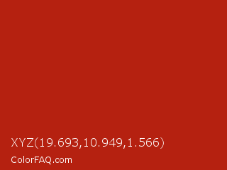 XYZ 19.693,10.949,1.566 Color is a normal red color and the nearest color is Carnelian #b31b1b. Hex code #b52110 and RGB value is rgb(181,33,16). In RGB color space, this color is composed of 71% red, 13% green, 6% blue, In CMYK color space, this color is composed of 0% cyan, 82% magenta, 91% yellow , 29% black , In HSL color space, this color has a hue angle of 6° , 84% saturation and 39% lightness.
