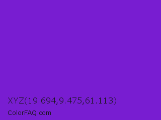 XYZ 19.694,9.475,61.113 Color is a normal violet color and the nearest color is French Violet #8806ce. Hex code #781dd1 and RGB value is rgb(120,29,209). In RGB color space, this color is composed of 47% red, 11% green, 82% blue, In CMYK color space, this color is composed of 43% cyan, 86% magenta, 0% yellow , 18% black , In HSL color space, this color has a hue angle of 270° , 76% saturation and 47% lightness.
