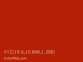 XYZ 19.6,10.868,1.208 Color is a normal red color and the nearest color is International Orange Engineering #ba160c. Hex code #b52005 and RGB value is rgb(181,32,5). In RGB color space, this color is composed of 71% red, 13% green, 2% blue, In CMYK color space, this color is composed of 0% cyan, 82% magenta, 97% yellow , 29% black , In HSL color space, this color has a hue angle of 9° , 95% saturation and 36% lightness.