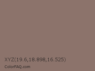 XYZ 19.6,18.898,16.525 Color is a normal color and the nearest color is Americano #87756e. Hex code #8c736b and RGB value is rgb(140,115,107). In RGB color space, this color is composed of 55% red, 45% green, 42% blue, In CMYK color space, this color is composed of 0% cyan, 18% magenta, 24% yellow , 45% black , In HSL color space, this color has a hue angle of 15° , 13% saturation and 48% lightness.