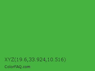 XYZ 19.6,33.924,10.516 Color is a normal green color and the nearest color is Apple #4fa83d. Hex code #46b341 and RGB value is rgb(70,179,65). In RGB color space, this color is composed of 27% red, 70% green, 25% blue, In CMYK color space, this color is composed of 61% cyan, 0% magenta, 64% yellow , 30% black , In HSL color space, this color has a hue angle of 117° , 47% saturation and 48% lightness.