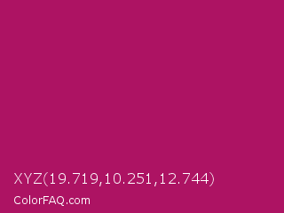 XYZ 19.719,10.251,12.744 Color is a normal rose color and the nearest color is Jazzberry Jam #a50b5e. Hex code #ad1363 and RGB value is rgb(173,19,99). In RGB color space, this color is composed of 68% red, 7% green, 39% blue, In CMYK color space, this color is composed of 0% cyan, 89% magenta, 43% yellow , 32% black , In HSL color space, this color has a hue angle of 329° , 80% saturation and 38% lightness.
