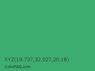 XYZ 19.737,32.027,20.18 Color is a normal green color and the nearest color is Medium Sea Green #3cb371. Hex code #3dad6f and RGB value is rgb(61,173,111). In RGB color space, this color is composed of 24% red, 68% green, 44% blue, In CMYK color space, this color is composed of 65% cyan, 0% magenta, 36% yellow , 32% black , In HSL color space, this color has a hue angle of 147° , 48% saturation and 46% lightness.