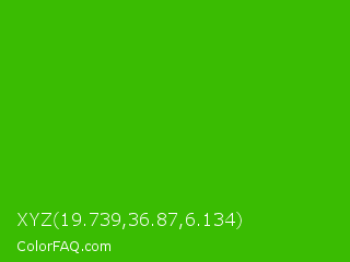 XYZ 19.739,36.87,6.134 Color is a normal green color and the nearest color is Kelly Green #4cbb17. Hex code #3abc02 and RGB value is rgb(58,188,2). In RGB color space, this color is composed of 23% red, 74% green, 1% blue, In CMYK color space, this color is composed of 69% cyan, 0% magenta, 99% yellow , 26% black , In HSL color space, this color has a hue angle of 102° , 98% saturation and 37% lightness.