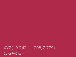 XYZ 19.742,11.208,7.779 Color is a normal red color and the nearest color is Amaranth Purple #ab274f. Hex code #af294b and RGB value is rgb(175,41,75). In RGB color space, this color is composed of 69% red, 16% green, 29% blue, In CMYK color space, this color is composed of 0% cyan, 77% magenta, 57% yellow , 31% black , In HSL color space, this color has a hue angle of 345° , 62% saturation and 42% lightness.