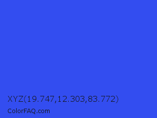 XYZ 19.747,12.303,83.772 Color is a normal blue color and the nearest color is Palatinate Blue #273be2. Hex code #334df0 and RGB value is rgb(51,77,240). In RGB color space, this color is composed of 20% red, 30% green, 94% blue, In CMYK color space, this color is composed of 79% cyan, 68% magenta, 0% yellow , 6% black , In HSL color space, this color has a hue angle of 232° , 86% saturation and 57% lightness.