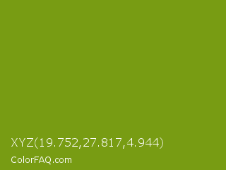 XYZ 19.752,27.817,4.944 Color is a normal lime color and the nearest color is Limeade #6f9d02. Hex code #789c13 and RGB value is rgb(120,156,19). In RGB color space, this color is composed of 47% red, 61% green, 7% blue, In CMYK color space, this color is composed of 23% cyan, 0% magenta, 88% yellow , 39% black , In HSL color space, this color has a hue angle of 76° , 78% saturation and 34% lightness.