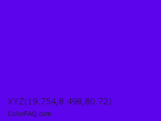 XYZ 19.754,8.498,80.72 Color is a normal violet color and the nearest color is Han Purple #5218fa. Hex code #5c05ed and RGB value is rgb(92,5,237). In RGB color space, this color is composed of 36% red, 2% green, 93% blue, In CMYK color space, this color is composed of 61% cyan, 98% magenta, 0% yellow , 7% black , In HSL color space, this color has a hue angle of 263° , 96% saturation and 47% lightness.