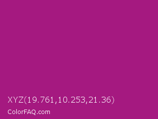 XYZ 19.761,10.253,21.36 Color is a normal magenta color and the nearest color is Violet Eggplant #991199. Hex code #a51980 and RGB value is rgb(165,25,128). In RGB color space, this color is composed of 65% red, 10% green, 50% blue, In CMYK color space, this color is composed of 0% cyan, 85% magenta, 22% yellow , 35% black , In HSL color space, this color has a hue angle of 316° , 74% saturation and 37% lightness.