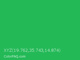 XYZ 19.762,35.743,14.874 Color is a normal green color and the nearest color is Chateau Green #40a860. Hex code #23b957 and RGB value is rgb(35,185,87). In RGB color space, this color is composed of 14% red, 73% green, 34% blue, In CMYK color space, this color is composed of 81% cyan, 0% magenta, 53% yellow , 27% black , In HSL color space, this color has a hue angle of 141° , 68% saturation and 43% lightness.
