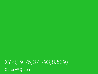 XYZ 19.76,37.793,8.539 Color is a normal green color and the nearest color is Lime Green #32cd32. Hex code #23bf2b and RGB value is rgb(35,191,43). In RGB color space, this color is composed of 14% red, 75% green, 17% blue, In CMYK color space, this color is composed of 82% cyan, 0% magenta, 77% yellow , 25% black , In HSL color space, this color has a hue angle of 123° , 69% saturation and 44% lightness.