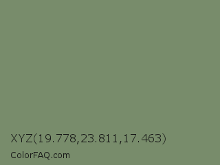 XYZ 19.778,23.811,17.463 Color is a normal green color and the nearest color is Camouflage Green #78866b. Hex code #788c6b and RGB value is rgb(120,140,107). In RGB color space, this color is composed of 47% red, 55% green, 42% blue, In CMYK color space, this color is composed of 14% cyan, 0% magenta, 24% yellow , 45% black , In HSL color space, this color has a hue angle of 96° , 13% saturation and 48% lightness.