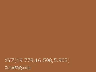 XYZ 19.779,16.598,5.903 Color is a normal orange color and the nearest color is Sepia Skin #9e5b40. Hex code #a16238 and RGB value is rgb(161,98,56). In RGB color space, this color is composed of 63% red, 38% green, 22% blue, In CMYK color space, this color is composed of 0% cyan, 39% magenta, 65% yellow , 37% black , In HSL color space, this color has a hue angle of 24° , 48% saturation and 43% lightness.