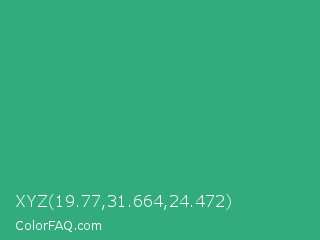 XYZ 19.77,31.664,24.472 Color is a normal green color and the nearest color is Jungle Green #29ab87. Hex code #32ac7d and RGB value is rgb(50,172,125). In RGB color space, this color is composed of 20% red, 67% green, 49% blue, In CMYK color space, this color is composed of 71% cyan, 0% magenta, 27% yellow , 33% black , In HSL color space, this color has a hue angle of 157° , 55% saturation and 44% lightness.