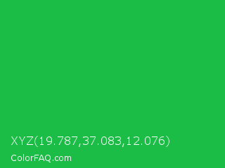 XYZ 19.787,37.083,12.076 Color is a normal green color and the nearest color is Dark Pastel Green #03c03c. Hex code #1bbd47 and RGB value is rgb(27,189,71). In RGB color space, this color is composed of 11% red, 74% green, 28% blue, In CMYK color space, this color is composed of 86% cyan, 0% magenta, 62% yellow , 26% black , In HSL color space, this color has a hue angle of 136° , 75% saturation and 42% lightness.