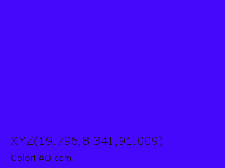 XYZ 19.796,8.341,91.009 Color is a normal indigo color and the nearest color is Electric Ultramarine #3f00ff. Hex code #4508fa and RGB value is rgb(69,8,250). In RGB color space, this color is composed of 27% red, 3% green, 98% blue, In CMYK color space, this color is composed of 72% cyan, 97% magenta, 0% yellow , 2% black , In HSL color space, this color has a hue angle of 255° , 96% saturation and 51% lightness.