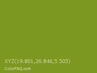 XYZ 19.801,26.846,5.505 Color is a normal lime color and the nearest color is Wasabi #788a25. Hex code #7c9820 and RGB value is rgb(124,152,32). In RGB color space, this color is composed of 49% red, 60% green, 13% blue, In CMYK color space, this color is composed of 18% cyan, 0% magenta, 79% yellow , 40% black , In HSL color space, this color has a hue angle of 74° , 65% saturation and 36% lightness.