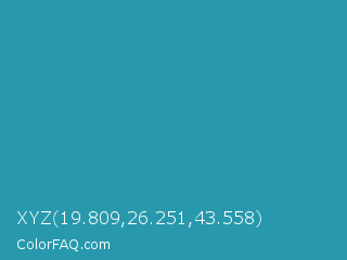 XYZ 19.809,26.251,43.558 Color is a normal cyan color and the nearest color is Eastern Blue #1e9ab0. Hex code #2899ad and RGB value is rgb(40,153,173). In RGB color space, this color is composed of 16% red, 60% green, 68% blue, In CMYK color space, this color is composed of 77% cyan, 12% magenta, 0% yellow , 32% black , In HSL color space, this color has a hue angle of 189° , 62% saturation and 42% lightness.