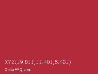 XYZ 19.811,11.401,5.431 Color is a normal red color and the nearest color is Well Read #b43332. Hex code #b12b3c and RGB value is rgb(177,43,60). In RGB color space, this color is composed of 69% red, 17% green, 24% blue, In CMYK color space, this color is composed of 0% cyan, 76% magenta, 66% yellow , 31% black , In HSL color space, this color has a hue angle of 352° , 61% saturation and 43% lightness.