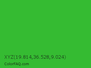 XYZ 19.814,36.528,9.024 Color is a normal green color and the nearest color is Wageningen Green #34b233. Hex code #35bb32 and RGB value is rgb(53,187,50). In RGB color space, this color is composed of 21% red, 73% green, 20% blue, In CMYK color space, this color is composed of 72% cyan, 0% magenta, 73% yellow , 27% black , In HSL color space, this color has a hue angle of 119° , 58% saturation and 46% lightness.